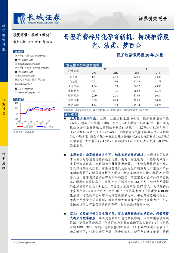 【长城证券】【20201129】轻工制造双周报20年24期:母婴消费碎片化孕育新机,持续推荐晨光、洁柔、梦百合-33页