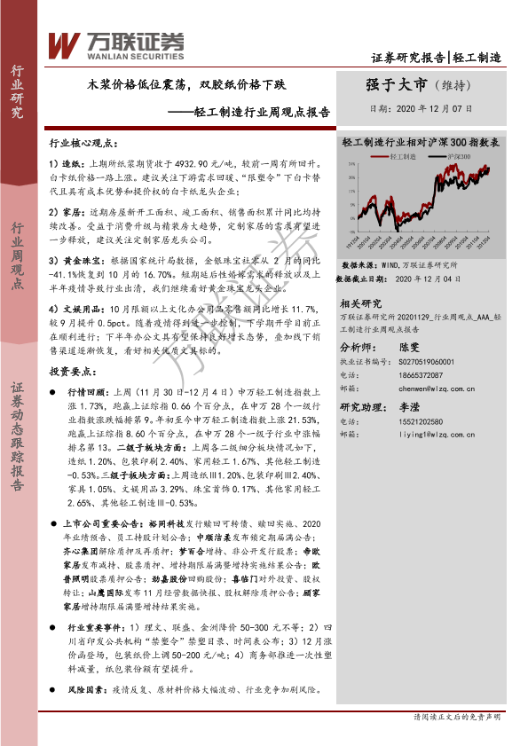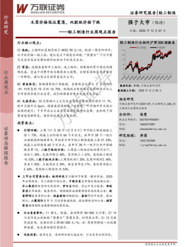 【万联证券】【20201207】20201207-万联证券-轻工制造行业周观点报告:木浆价格低位震荡,双胶纸价格下跌-13页