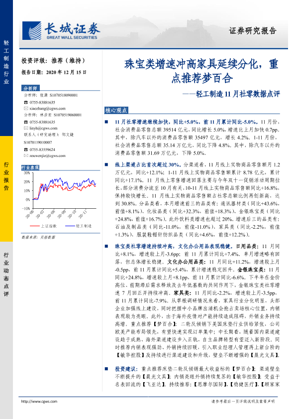 【长城证券】【20201215】轻工制造11月社零数据点评:珠宝类增速冲高家具延续分化,重点推荐梦百合-5页