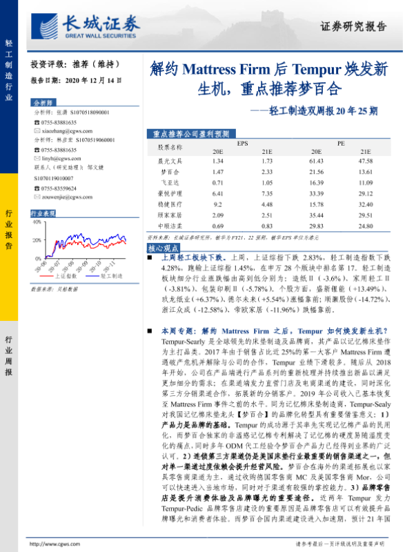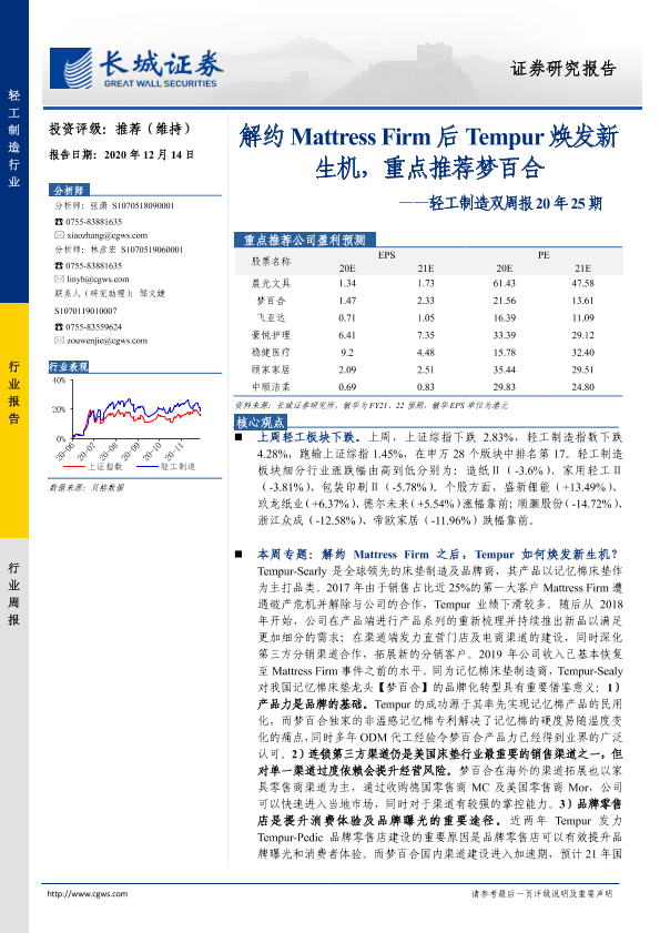 【长城证券】【20201214】轻工制造双周报20年25期:解约Mattress Firm后Tempur焕发新生机,重点推荐梦百合-32页
