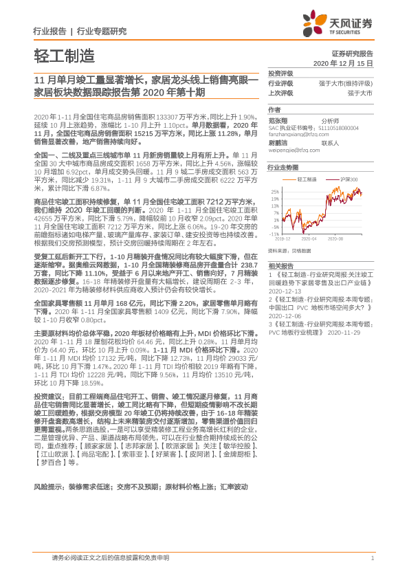 【天风证券】【20201215】20201215-天风证券-家居板块数据跟踪报告第2020年第十期:11月单月竣工量显著增长,家居龙头线上销售亮眼-16页