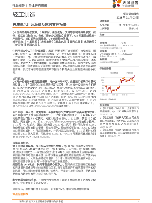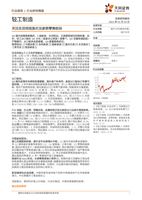 【天风证券】【20210103】20210103-天风证券-轻工制造行业研究周报:关注生活用纸涨价及家居零售板块-15页