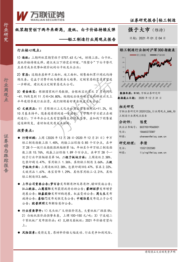 【万联证券】【20210104】20210104-万联证券-轻工制造行业周观点报告:纸浆期货创下两年来新高,废纸、白卡价格持续反弹-13页