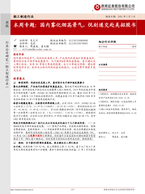 【浙商证券】【20210103】20210103-浙商证券-轻工制造行业本周专题:国内雾化烟高景气,悦刻递交赴美招股书-27页