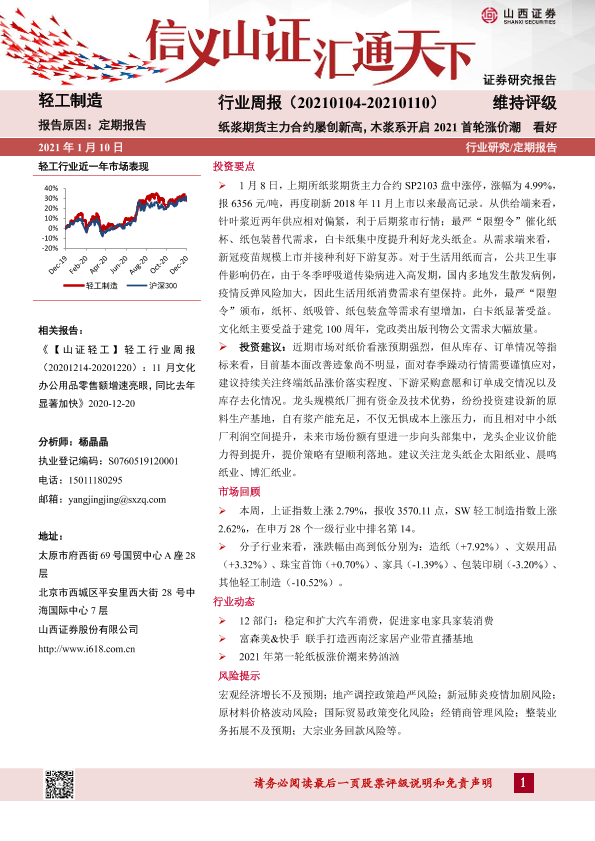 【山西证券】【20210110】20210110-山西证券-轻工制造行业周报:纸浆期货主力合约屡创新高,木浆系开启2021首轮涨价潮-14页