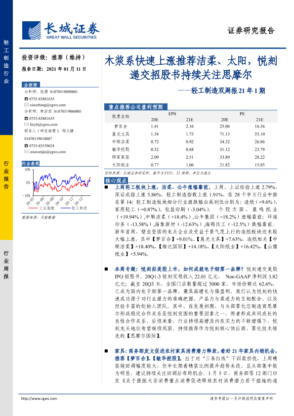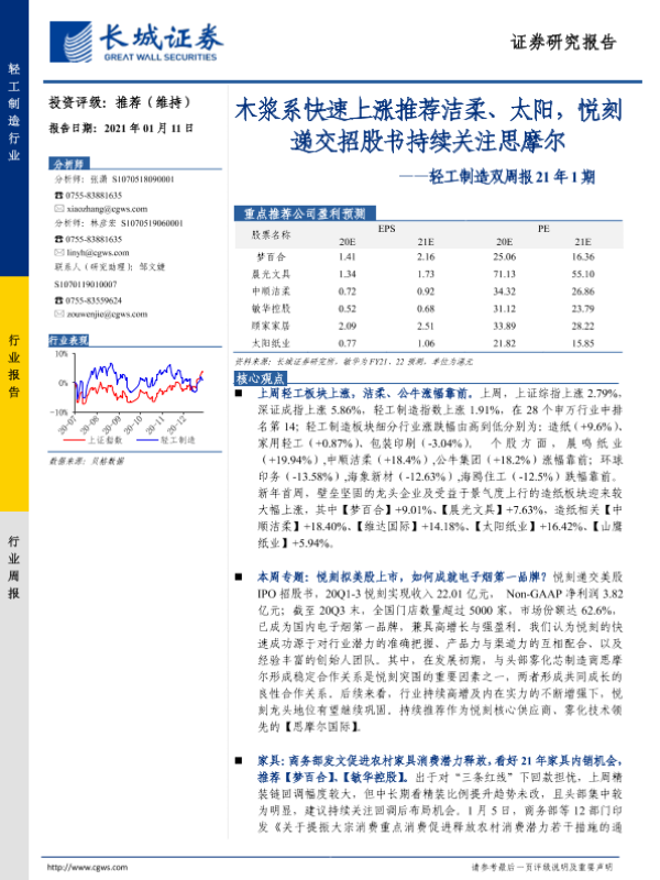 【长城证券】【20210111】20210111-长城证券-轻工制造双周报21年1期:木浆系快速上涨推荐洁柔、太阳,悦刻递交招股书持续关注思摩尔-32页
