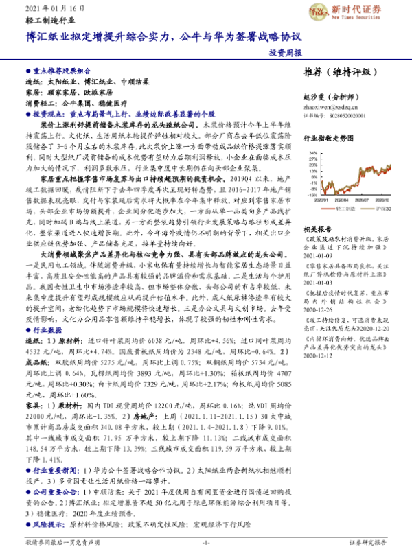 【新时代证券】【20210116】20210116-新时代证券-轻工制造行业投资周报:博汇纸业拟定增提升综合实力,公牛与华为签署战略协议-22页
