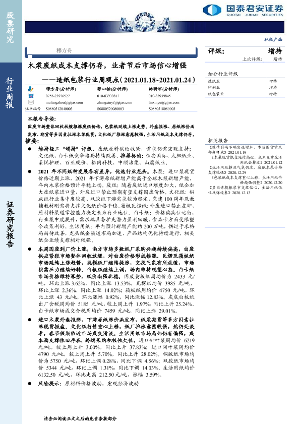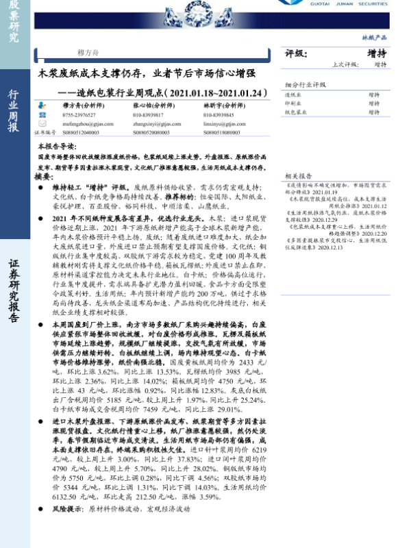 【国泰君安证券】【20210126】20210126-国泰君安-造纸包装行业周观点:木浆废纸成本支撑仍存,业者节后市场信心增强-4页
