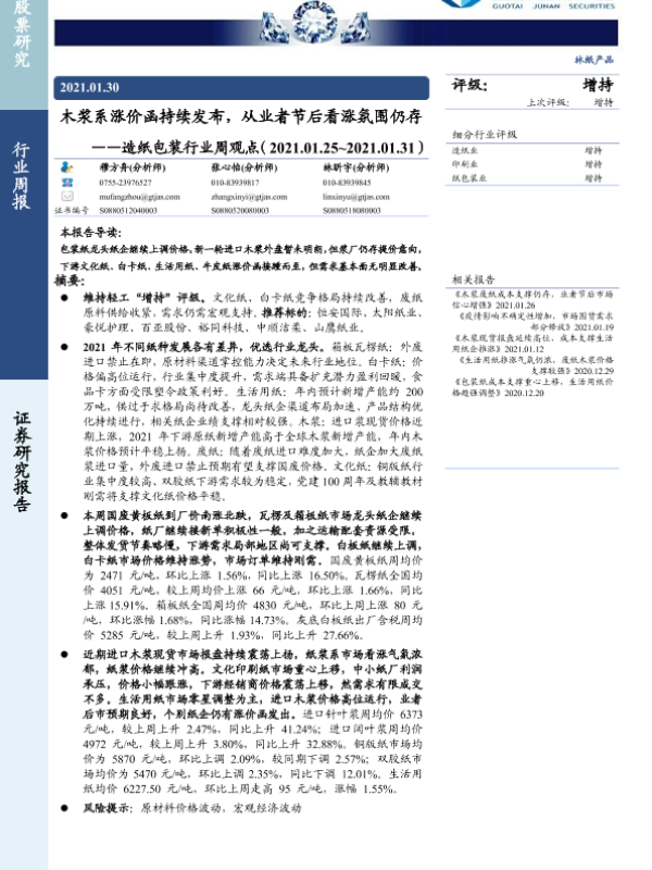 【国泰君安证券】【20210130】20210130-国泰君安-造纸包装行业周观点:木浆系涨价函持续发布,从业者节后看涨氛围仍存-4页