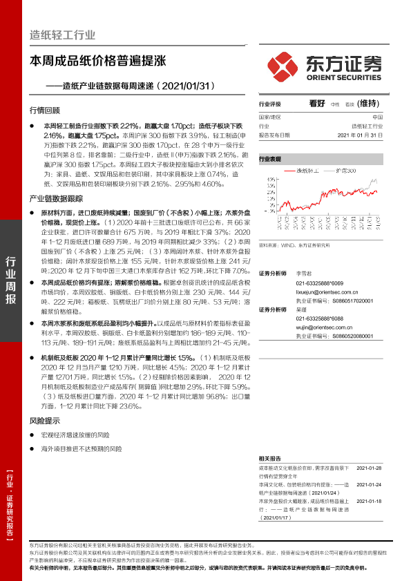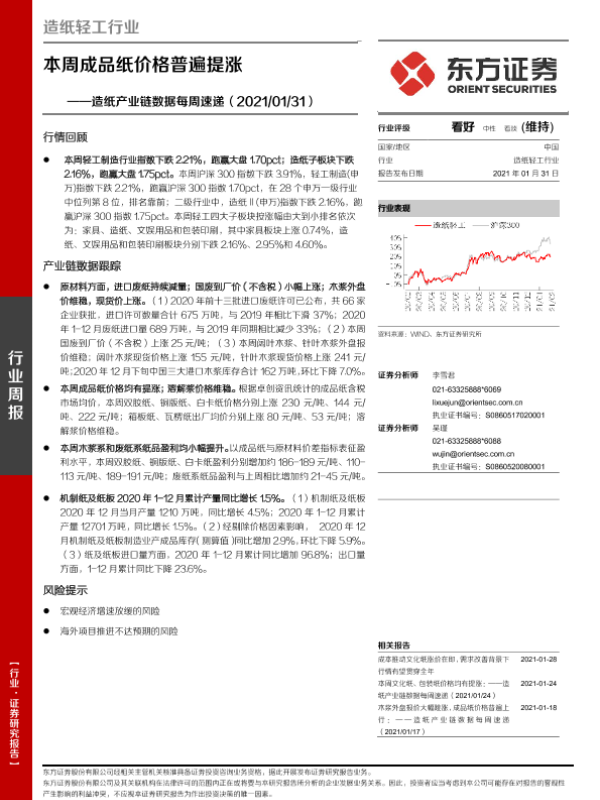 【东方证券】【20210131】20210131-东方证券-造纸产业链数据每周速递:本周成品纸价格普遍提涨-15页