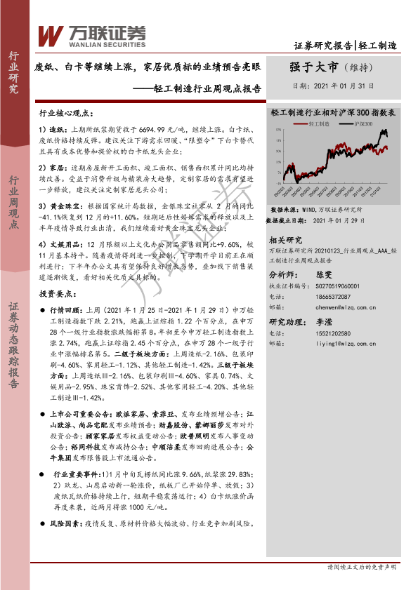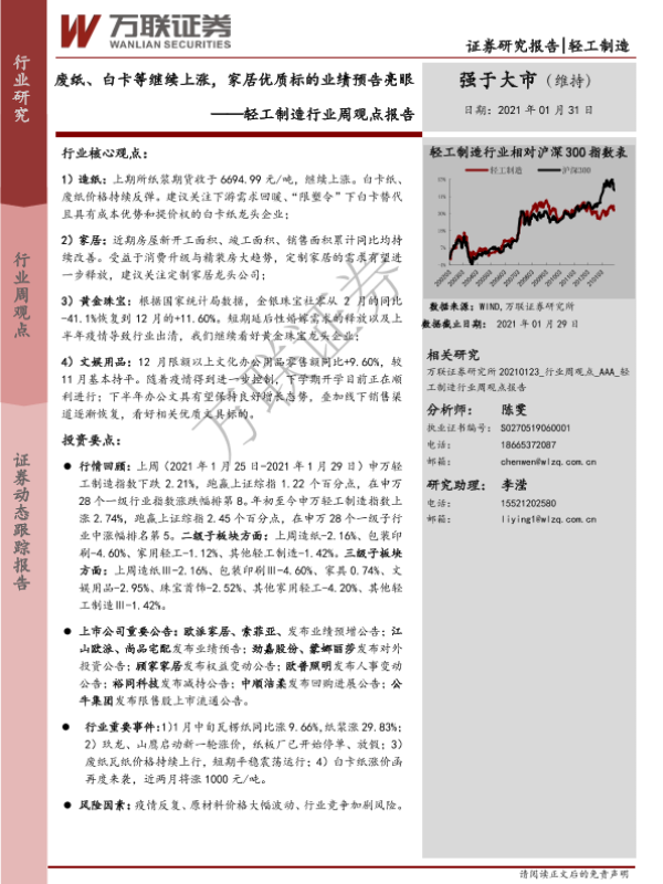 【万联证券】【20210131】20210131-万联证券-轻工制造行业周观点报告:废纸、白卡等继续上涨,家居优质标的业绩预告亮眼-13页