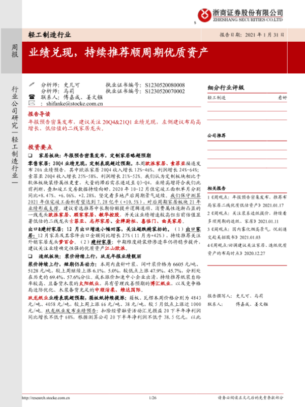 【浙商证券】【20210131】20210131-浙商证券-轻工制造行业:业绩兑现,持续推荐顺周期优质资产-26页