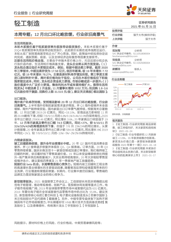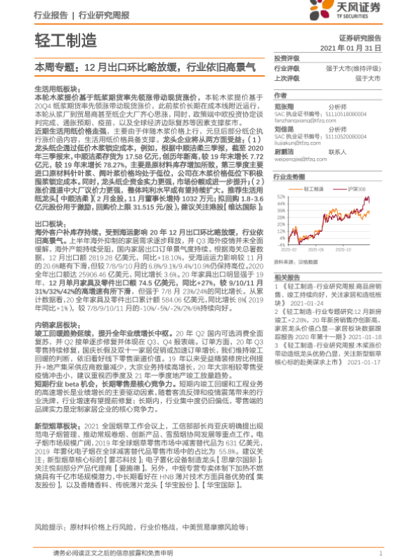 出口分析 家居行业 新型烟草 轻工制造 造纸行业