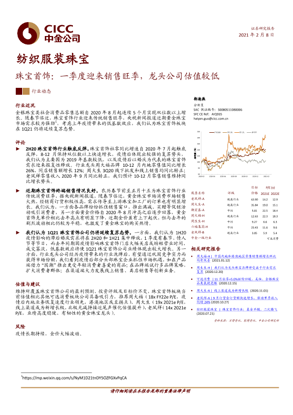 【中金公司】【20210208】珠宝首饰:一季度迎来销售旺季,龙头公司估值较低-6页