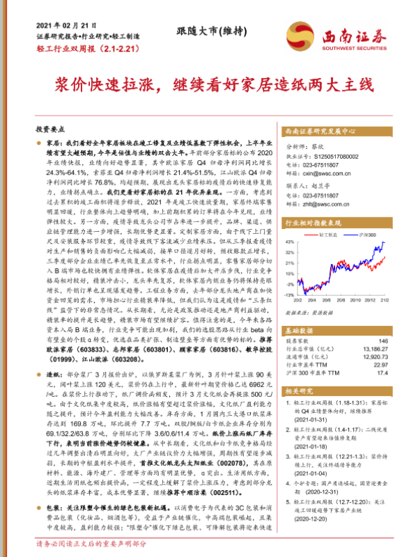 【西南证券】【20210221】20210221-西南证券-轻工行业双周报 :浆价快速拉涨,继续看好家居造纸两大主线-16页