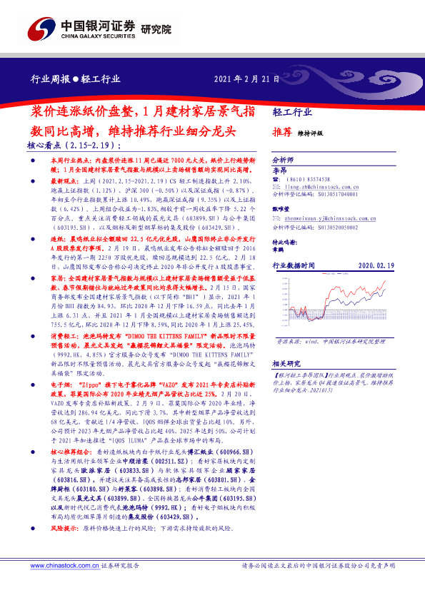 【银河证券】【20210221】20210221-中国银河-轻工行业周报:浆价连涨纸价盘整,1月建材家居景气指数同比高增,维持推荐行业细分龙头-38页