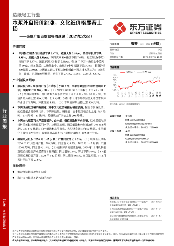 【东方证券】【20210228】20210228-东方证券-造纸产业链数据每周速递:木浆外盘报价跳涨,文化纸价格显著上扬-14页