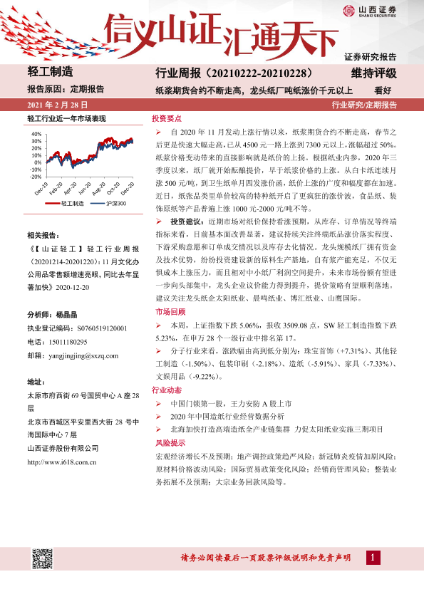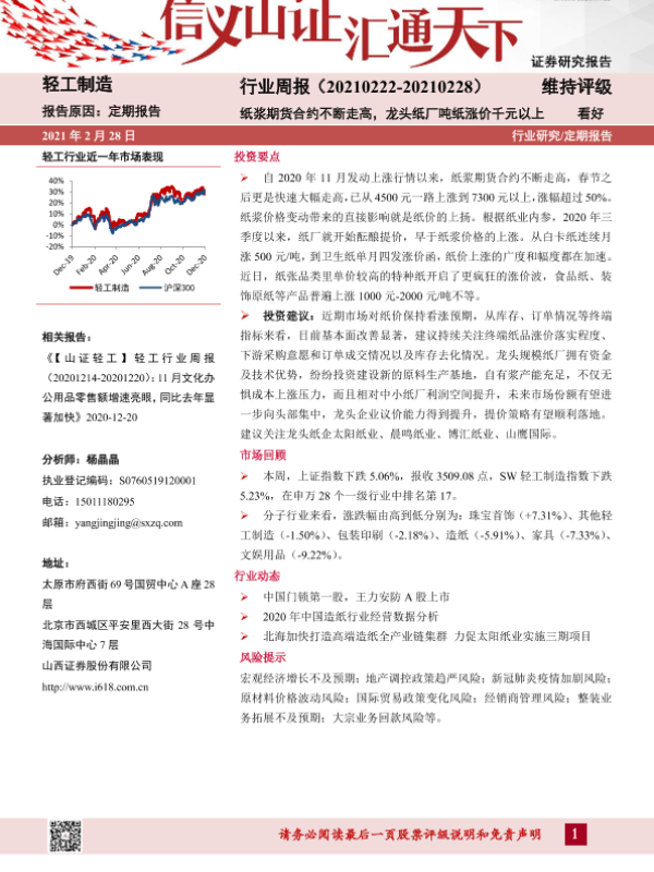 【山西证券】【20210228】轻工制造行业周报:纸浆期货合约不断走高,龙头纸厂吨纸涨价千元以上-12页