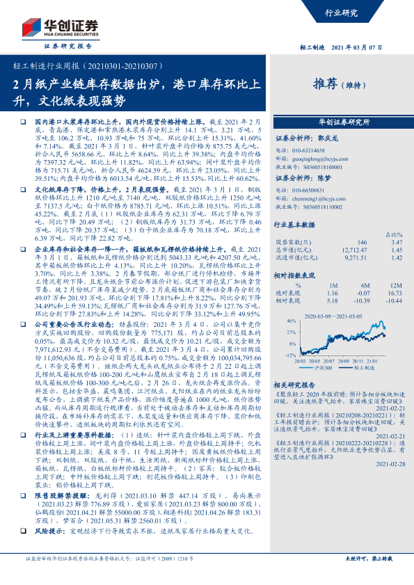 【华创证券】【20210307】20210307-华创证券-轻工制造行业周报:2月纸产业链库存数据出炉,港口库存环比上升,文化纸表现强势-15页