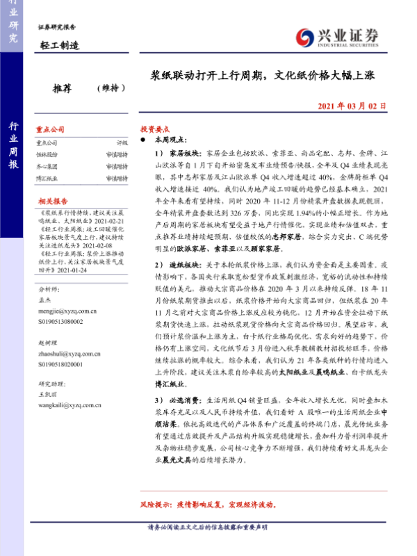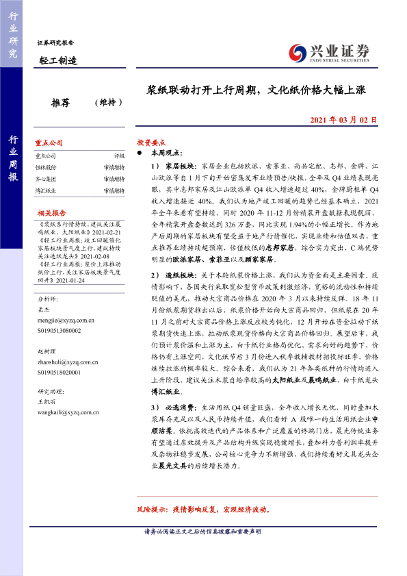 【兴业证券】【20210302】20210302-兴业证券-轻工制造行业周报:浆纸联动打开上行周期,文化纸价格大幅上涨-24页