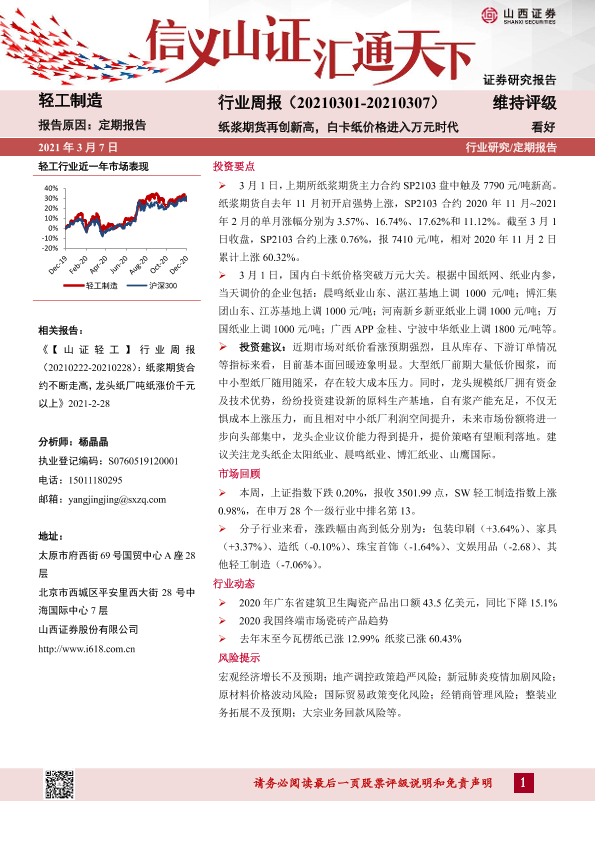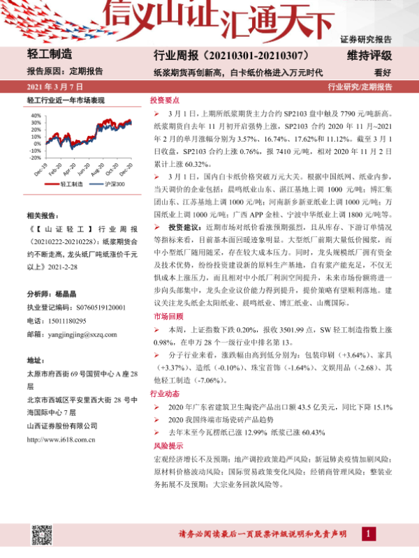 【山西证券】【20210307】20210307-山西证券-轻工制造行业周报:纸浆期货再创新高,白卡纸价格进入万元时代-14页