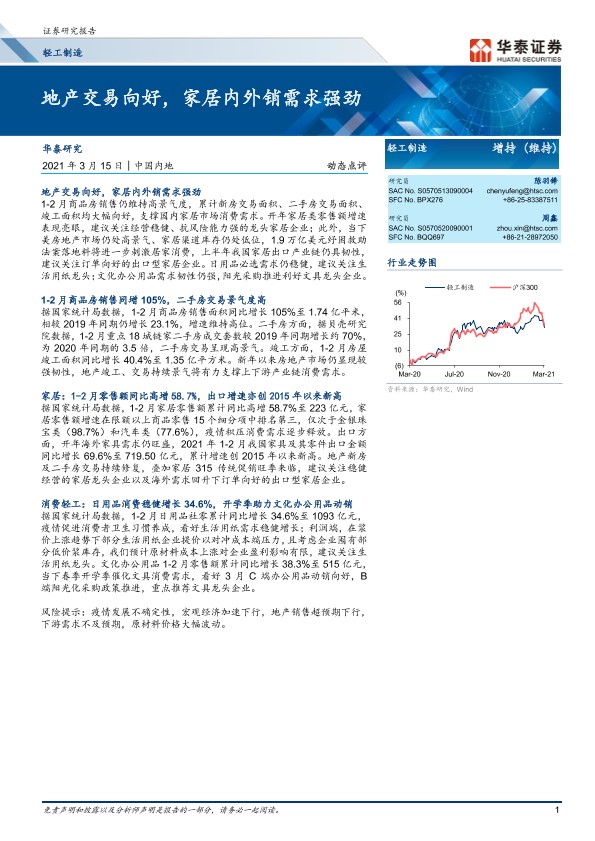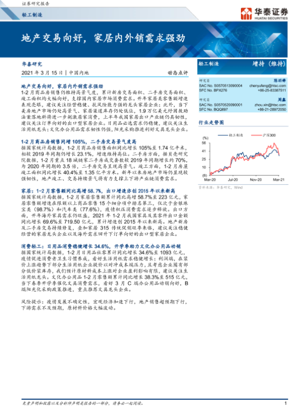 【华泰证券】【20210315】轻工制造:地产交易向好,家居内外销需求强劲-6页