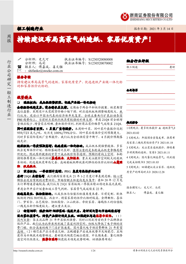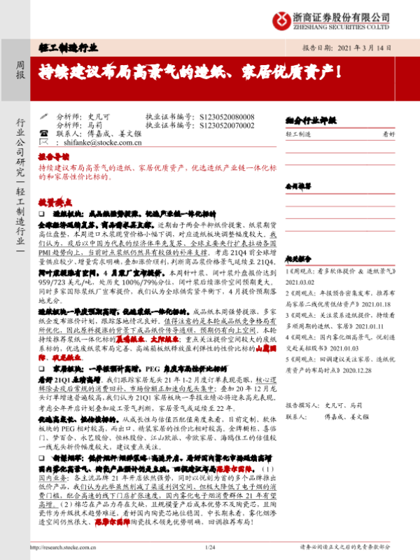 【浙商证券】【20210314】20210314-浙商证券-轻工制造行业周报:持续建议布局高景气的造纸、家居优质资产!-24页