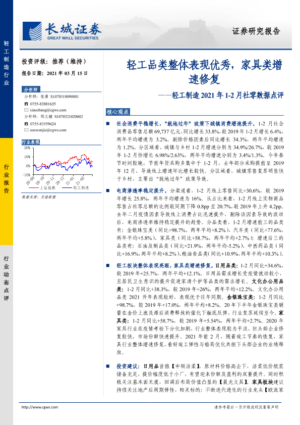 【长城证券】【20210315】轻工制造2021年1-2月社零数据点评:轻工品类整体表现优秀,家具类增速修复-5页