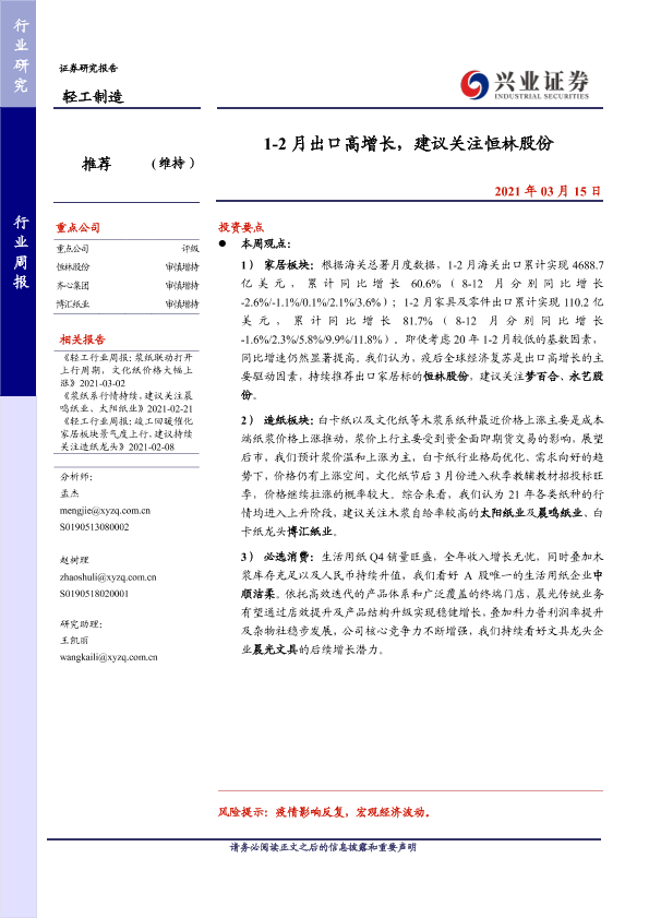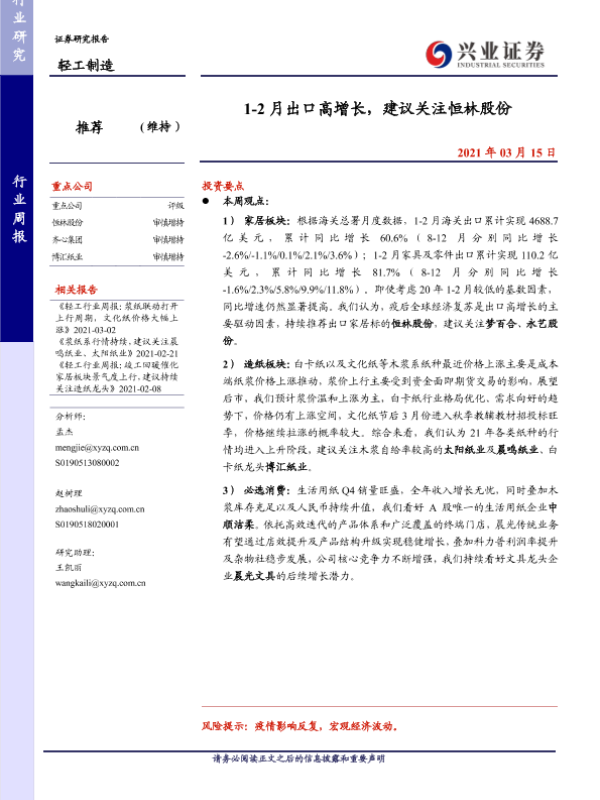 【兴业证券】【20210315】20210315-兴业证券-轻工制造行业周报:1-2月出口高增长,建议关注恒林股份-23页