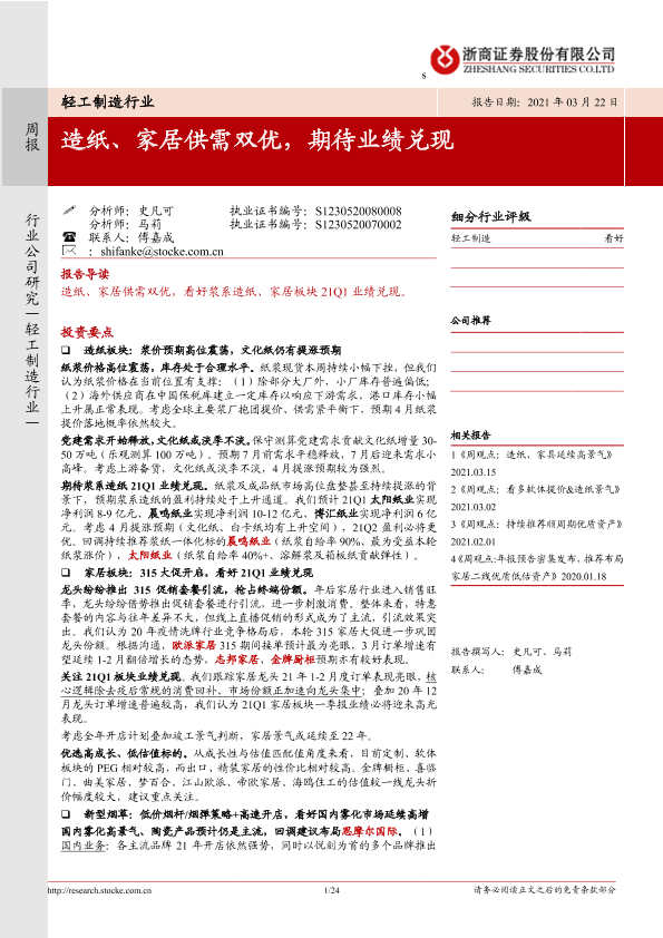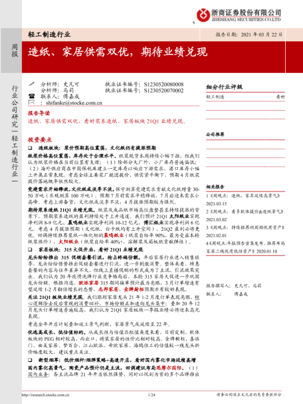 【浙商证券】【20210322】轻工制造行业:造纸、家居供需双优,期待业绩兑现-24页