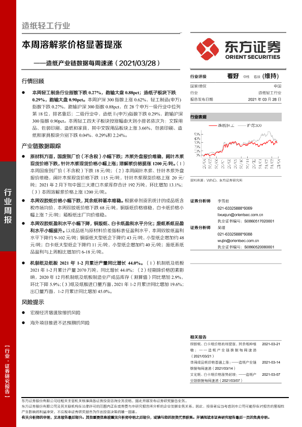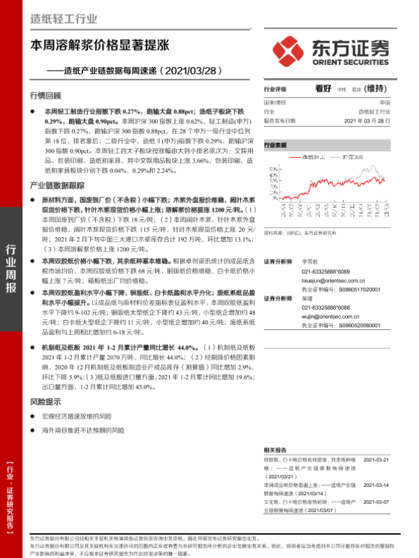 【东方证券】【20210328】20210328-东方证券-造纸产业链数据每周速递:本周溶解浆价格显著提涨-14页