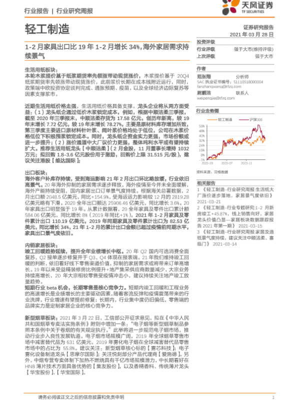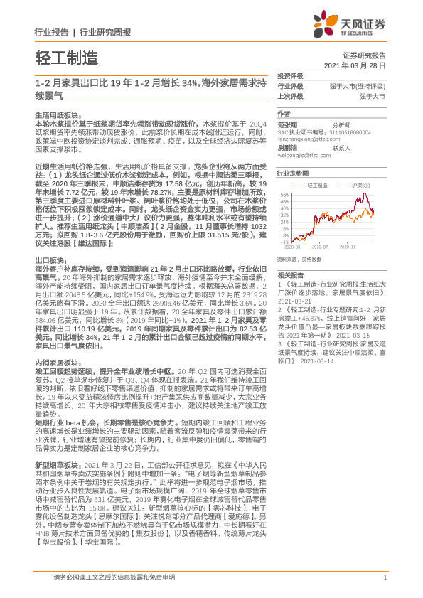 【天风证券】【20210328】轻工制造行业研究周报:1-2月家具出口比19年1-2月增长34%,海外家居需求持续景气-18页