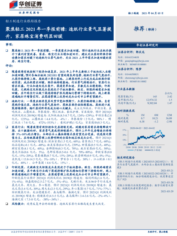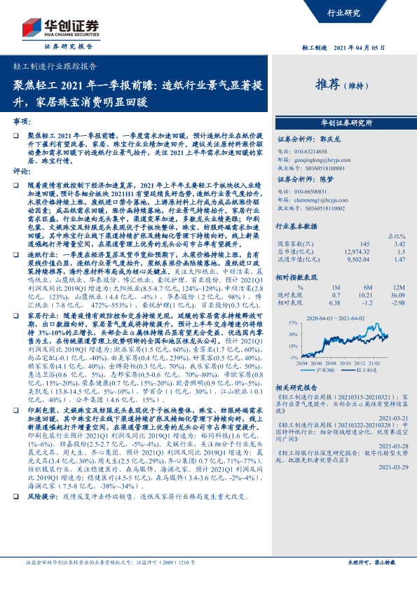 【华创证券】【20210405】轻工制造行业跟踪报告:聚焦轻工2021年一季报前瞻:造纸行业景气显著提升,家居珠宝消费明显回暖-6页