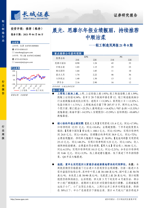 【长城证券】【20210406】20210406-长城证券-轻工制造行业双周报21年8期:晨光、思摩尔年报业绩靓丽,持续推荐中顺洁柔-22页