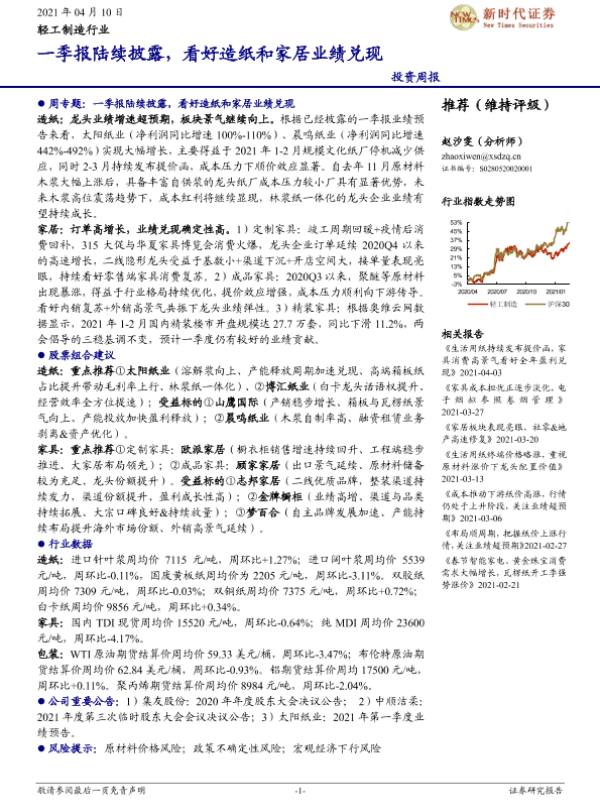 【新时代证券】【20210410】20210410-新时代证券-轻工制造行业投资周报:一季报陆续披露,看好造纸和家居业绩兑现-18页
