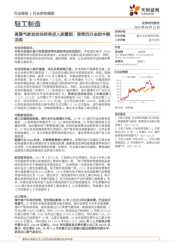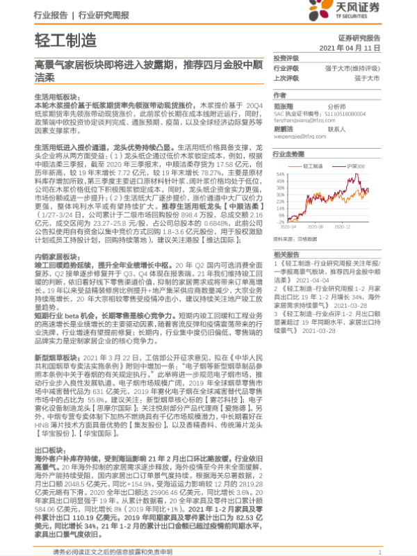 【天风证券】【20210411】轻工制造行业研究周报:高景气家居板块即将进入披露期,推荐四月金股中顺洁柔-18页