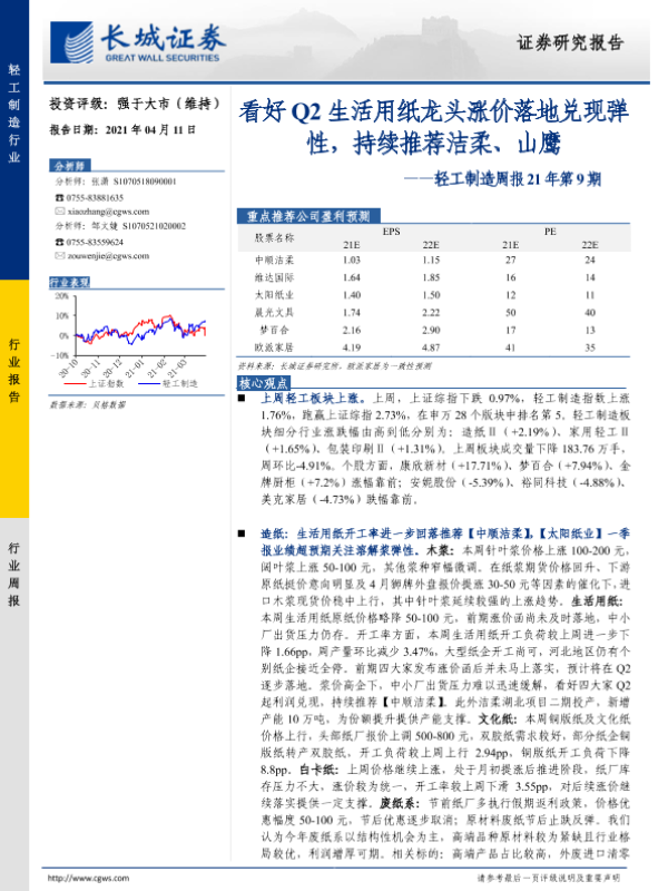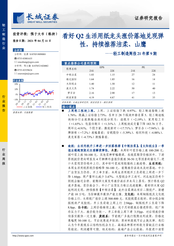 【长城证券】【20210411】20210411-长城证券-轻工制造周报21年第9期:看好Q2生活用纸龙头涨价落地兑现弹性,持续推荐洁柔、山鹰-22页