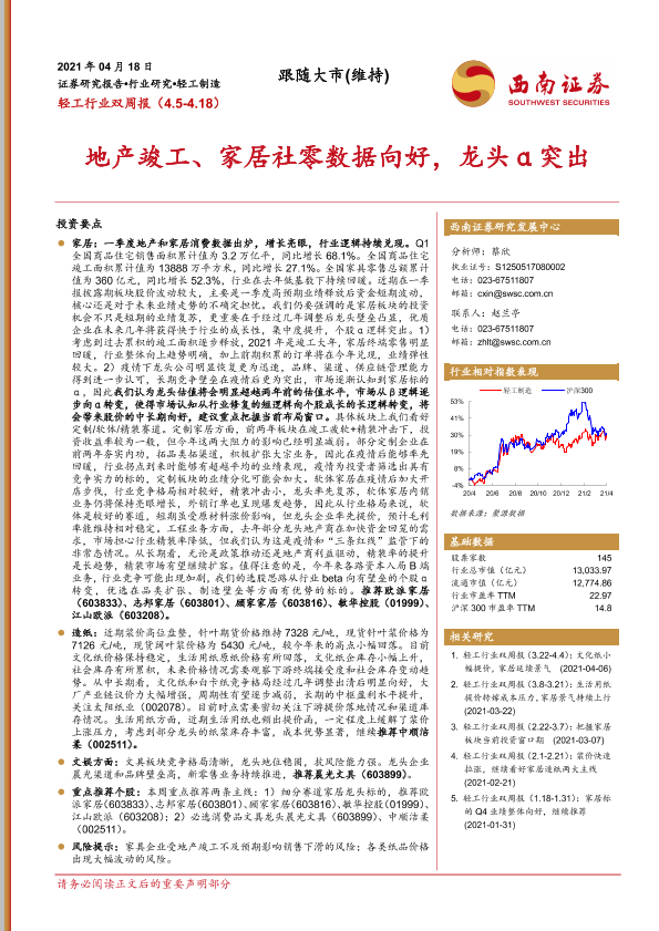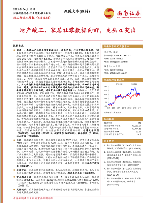【西南证券】【20210418】20210418-西南证券-轻工行业双周报:地产竣工、家居社零数据向好,龙头α突出-16页