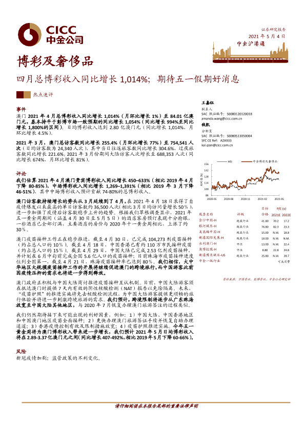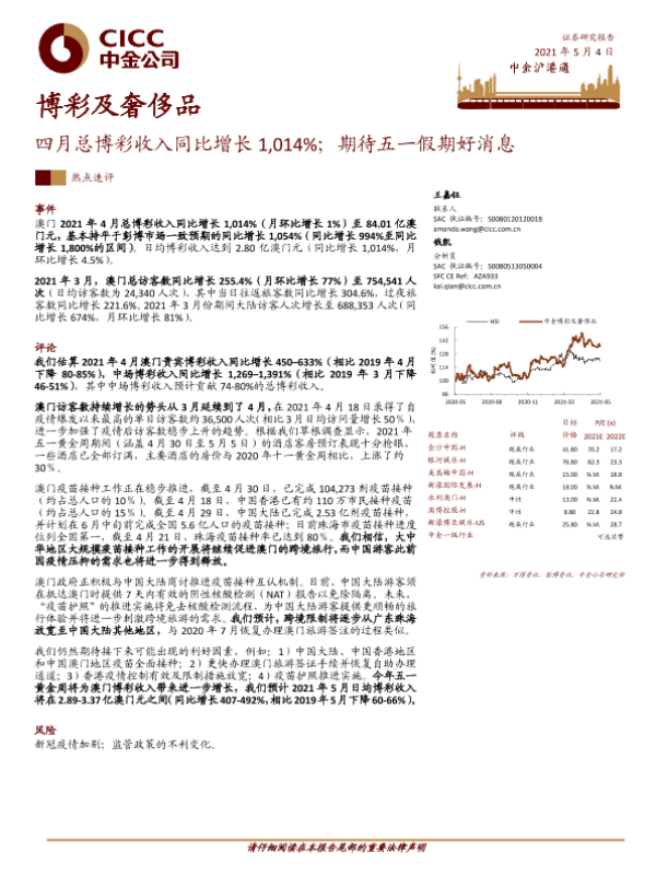 【中金公司】【20210504】博彩及奢侈品:四月总博彩收入同比增长1,014%;期待五一假期好消息-8页