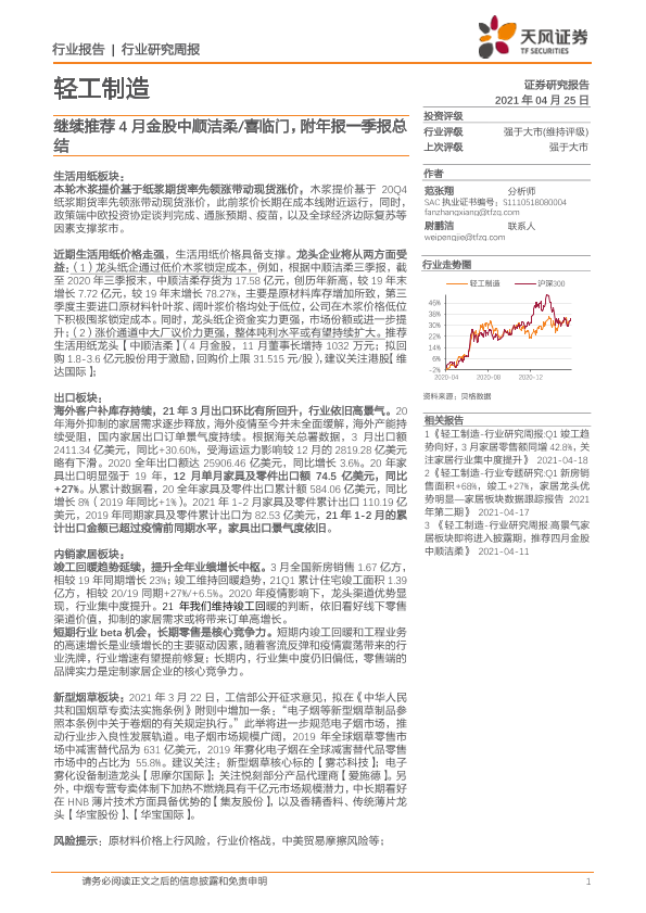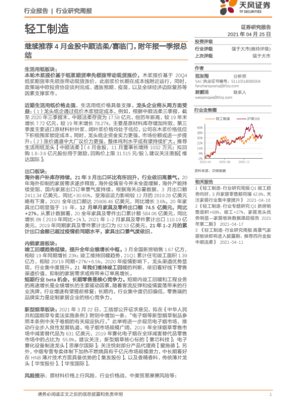 【天风证券】【20210425】20210425-天风证券-轻工制造行业研究周报:继续推荐4月金股中顺洁柔 喜临门,附年报一季报总结-24页
