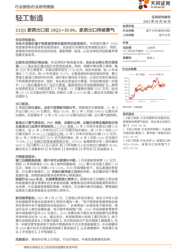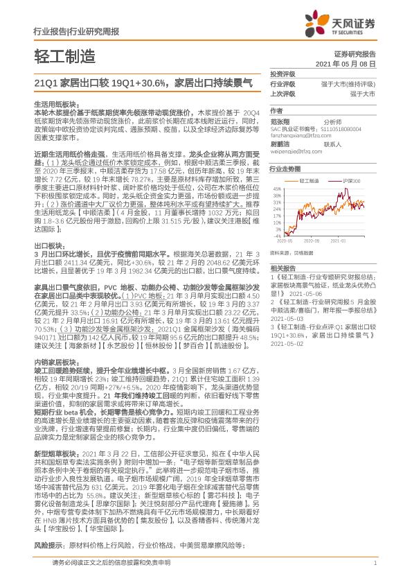 【天风证券】【20210508】20210508-天风证券-轻工制造行业研究周报:21Q1家居出口较19Q1+30.6%,家居出口持续景气-21页