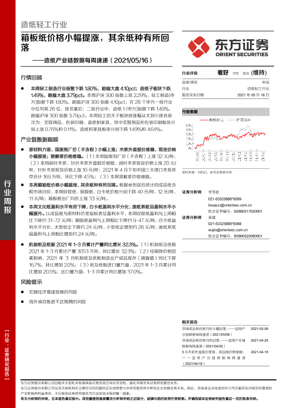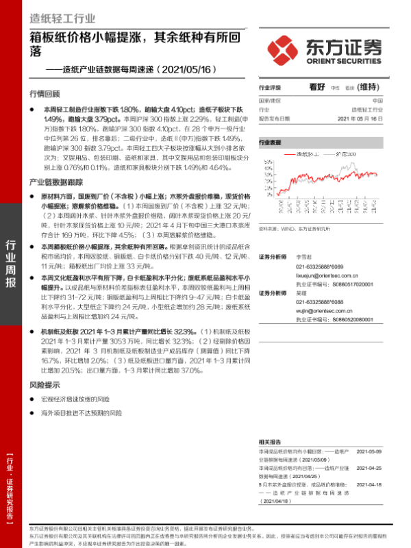 【东方证券】【20210516】20210516-东方证券-造纸产业链数据每周速递:箱板纸价格小幅提涨,其余纸种有所回落-13页