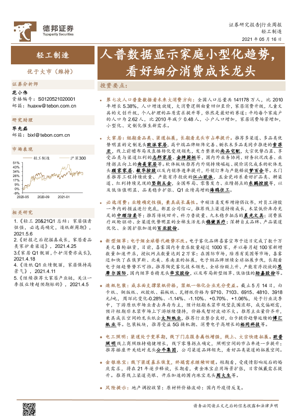 【德邦证券】【20210516】20210516-德邦证券-轻工制造行业周报:人普数据显示家庭小型化趋势,看好细分消费成长龙头-17页