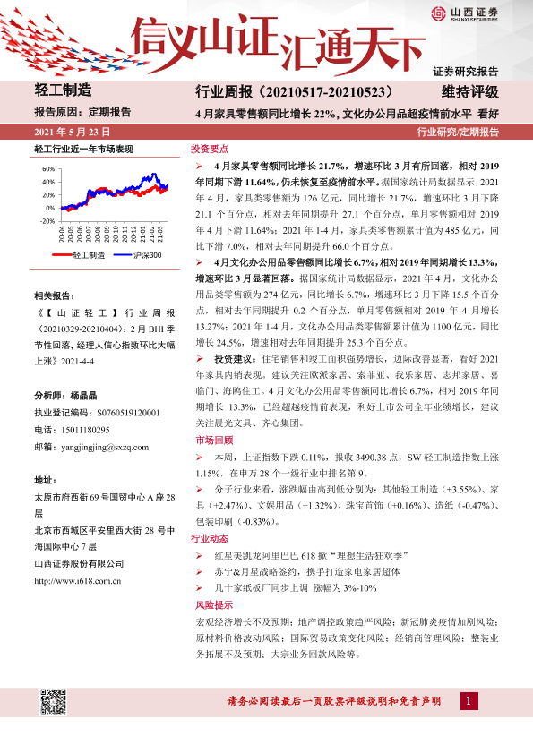 【山西证券】【20210523】20210523-山西证券-轻工制造行业周报:4月家具零售额同比增长22%,文化办公用品超疫情前水平-13页