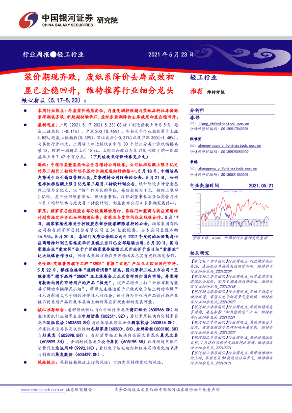 【银河证券】【20210523】20210523-中国银河-轻工行业周报:浆价期现齐跌,废纸系降价去库成效初显已企稳回升,维持推荐行业细分龙头-35页