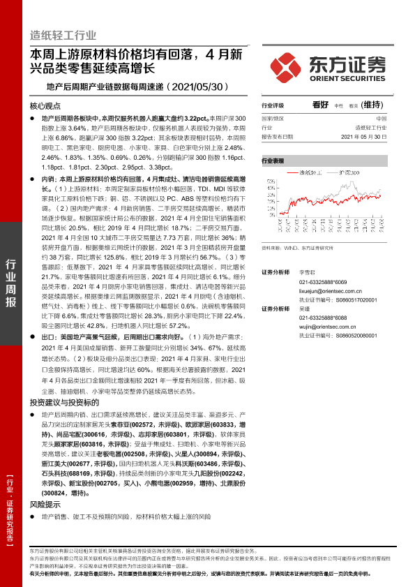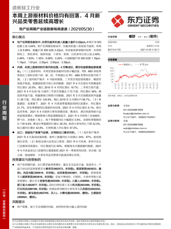 【东方证券】【20210530】20210530-东方证券-地产后周期产业链数据每周速递:本周上游原材料价格均有回落,4月新兴品类零售延续高增长-13页