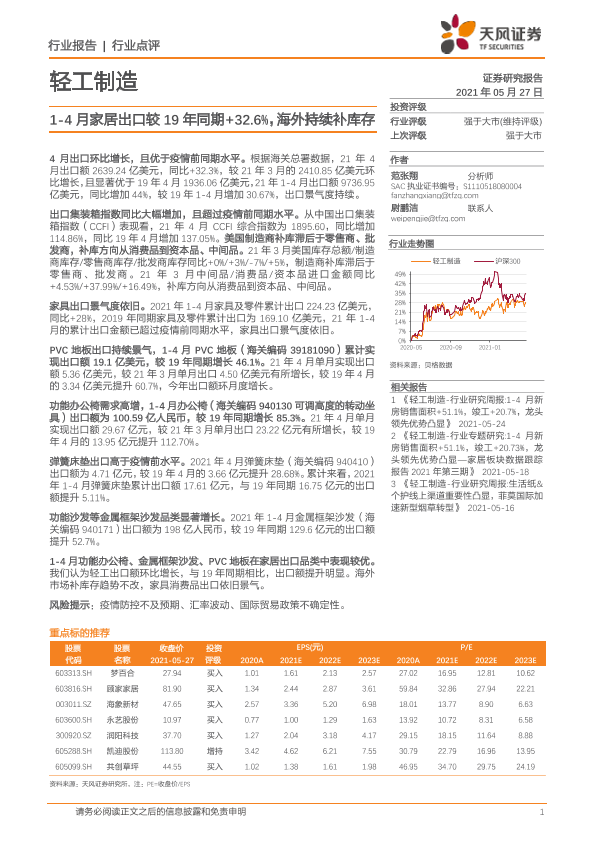 【天风证券】【20210527】轻工制造行业:1-4月家居出口较19年同期+32.6%,海外持续补库存-6页