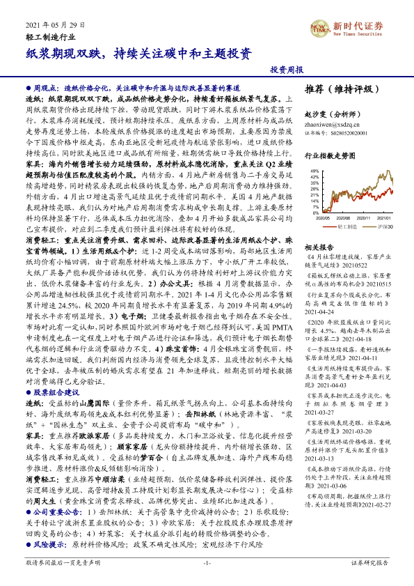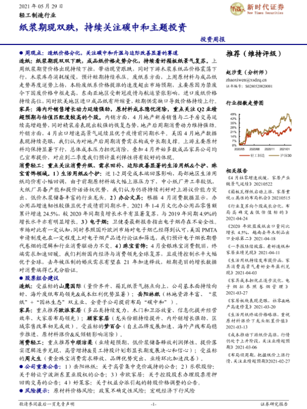 【新时代证券】【20210529】20210529-新时代证券-轻工制造行业投资周报:纸浆期现双跌,持续关注碳中和主题投资-15页