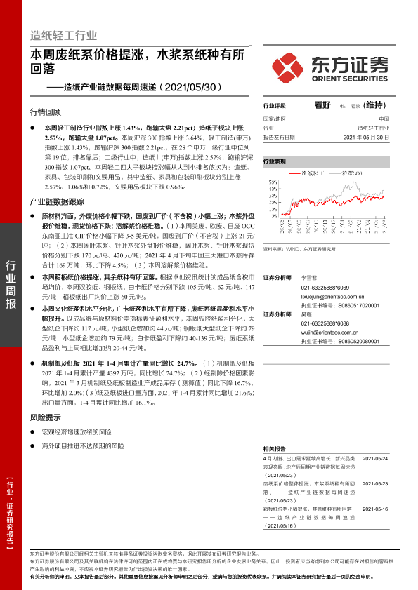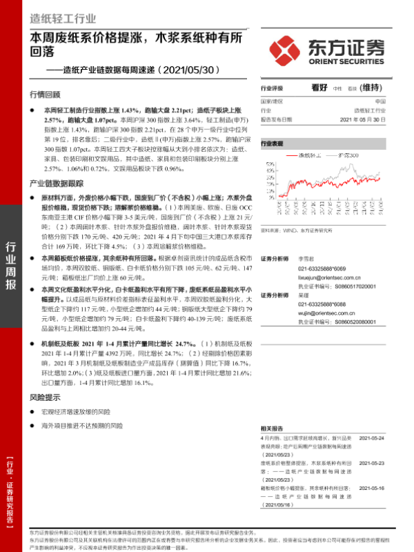 【东方证券】【20210530】20210530-东方证券-造纸产业链数据每周速递:本周废纸系价格提涨,木浆系纸种有所回落-13页