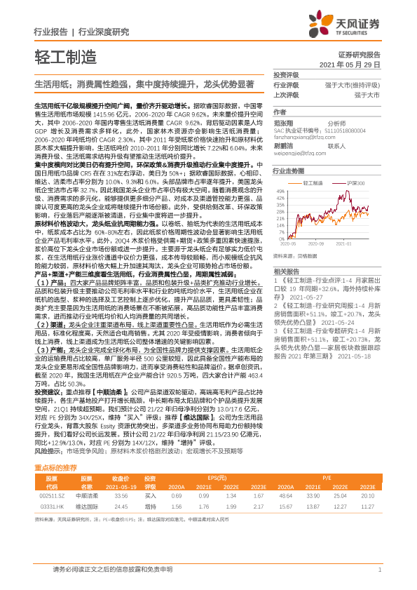 【天风证券】【20210529】轻工制造行业深度研究:生活用纸:消费属性趋强,集中度持续提升,龙头优势显著-33页
